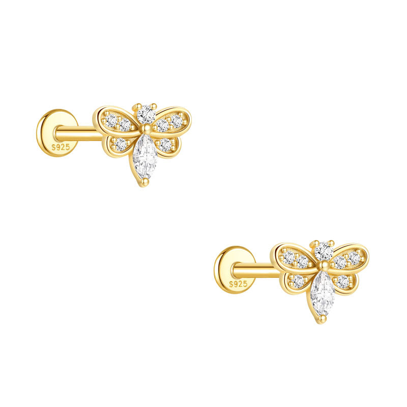 S925 Sterling Silver Bee Flat Back Earrings 5A Zircon Gold Plated Comfort Fit