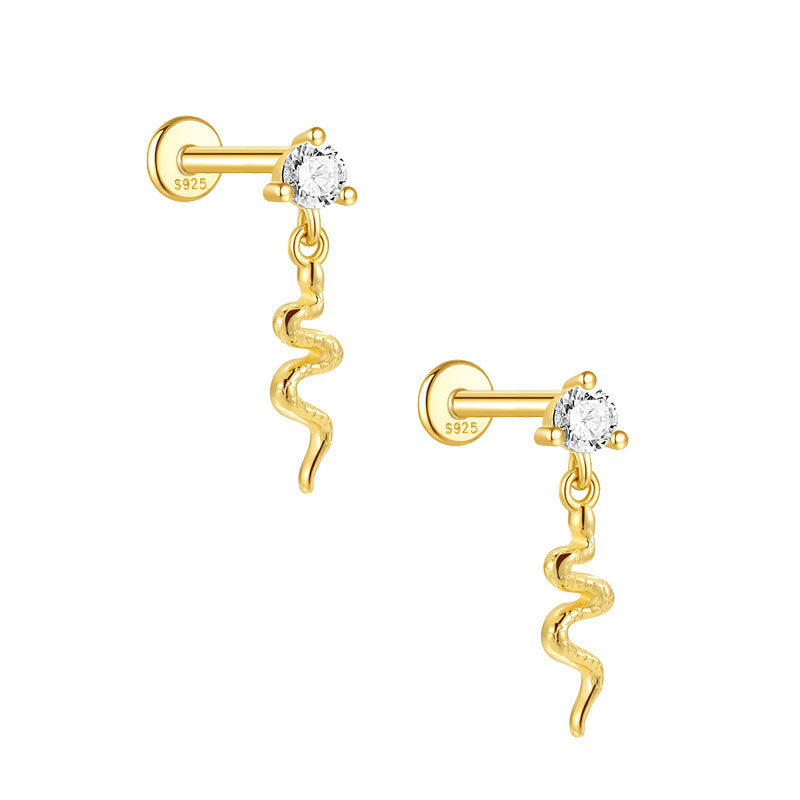 S925 Sterling Silver Snake Dangle Flat Back Earrings Gold Plated Zircon Hypoallergenic Design