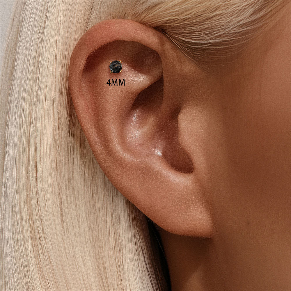 Round Black Hair Quartz Flat Back Earrings S925 Gold Plated Sterling Silver Dainty Lobe & Cartilage Studs