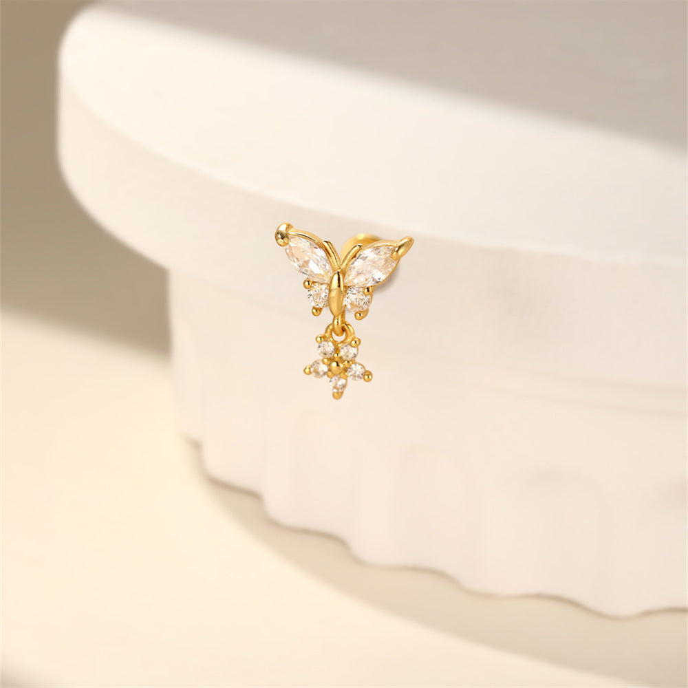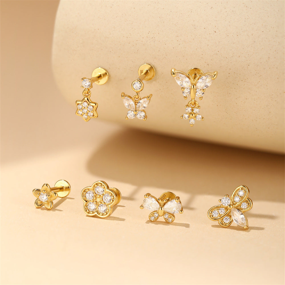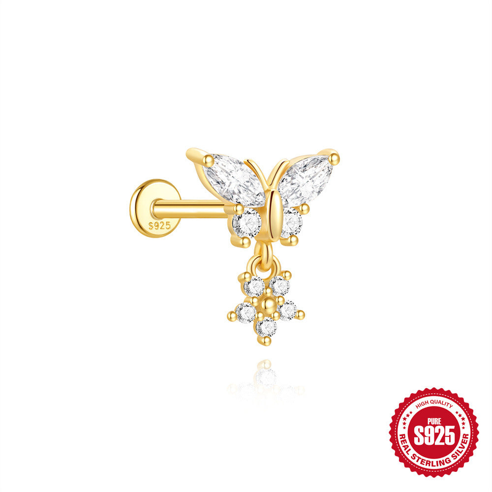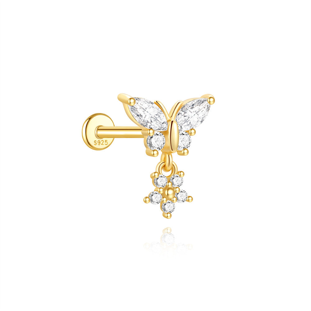Butterfly & Zircon Flower Flat Back Earrings 925 Sterling Silver Gold Plated Cartilage Jewelry