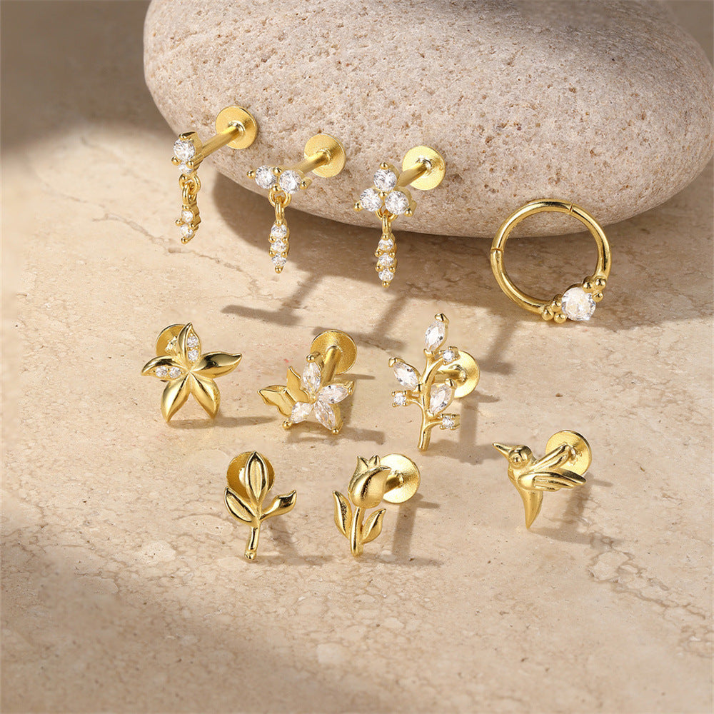 Gold Flower Flat Back Earrings 925 Silver Zircon Cartilage Piercing Earring