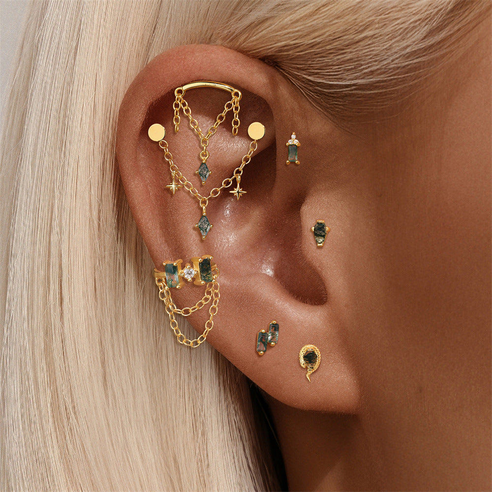 Unique Chain Accent Moss Agate Flat Back Earrings S925 Gold Plated Sterling Silver Delicate Cartilage Earring