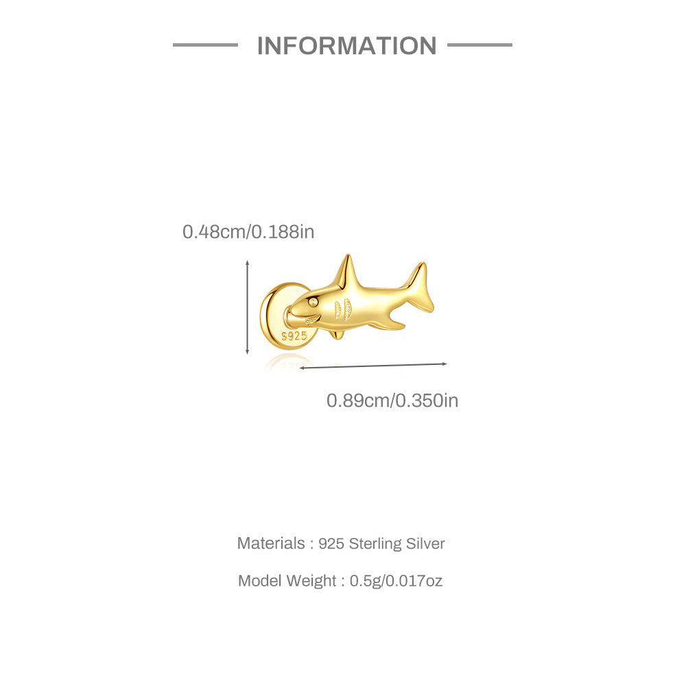 Cute Gold Shark Flat Back Earrings 925 Sterling Silver Animal Cartilage Piercing Earring