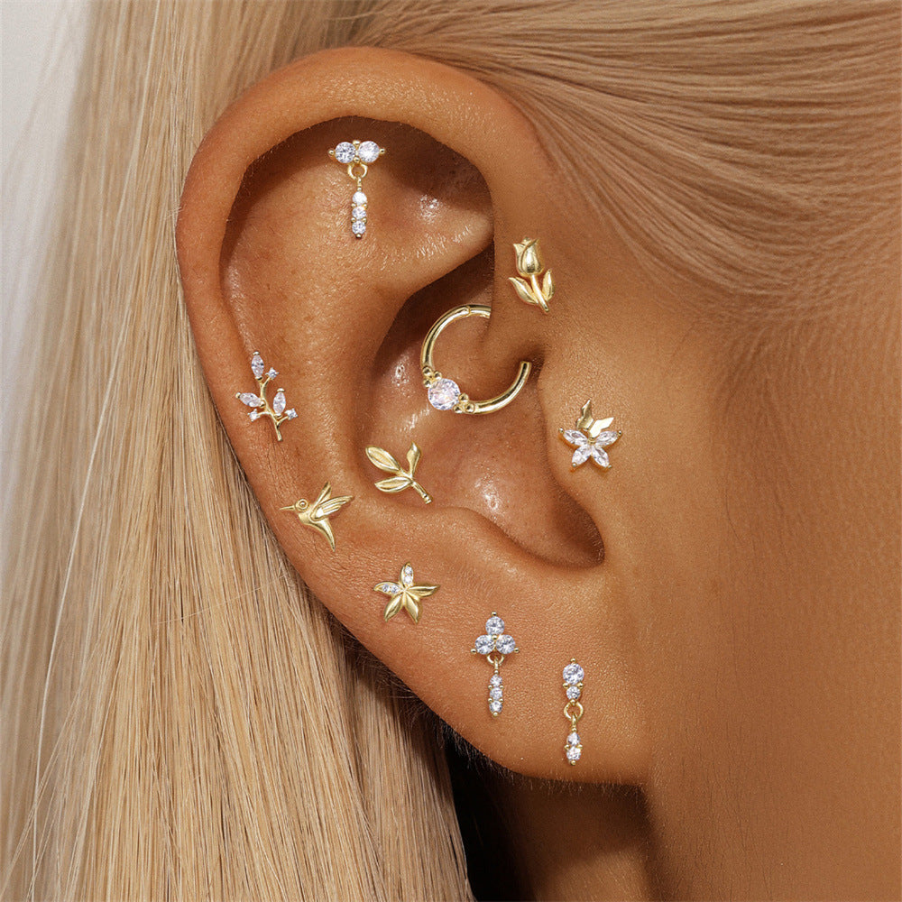 Petal Dangle Flat Back Earring S925 Sterling Silver Zircon Gold Cartilage Jewelry