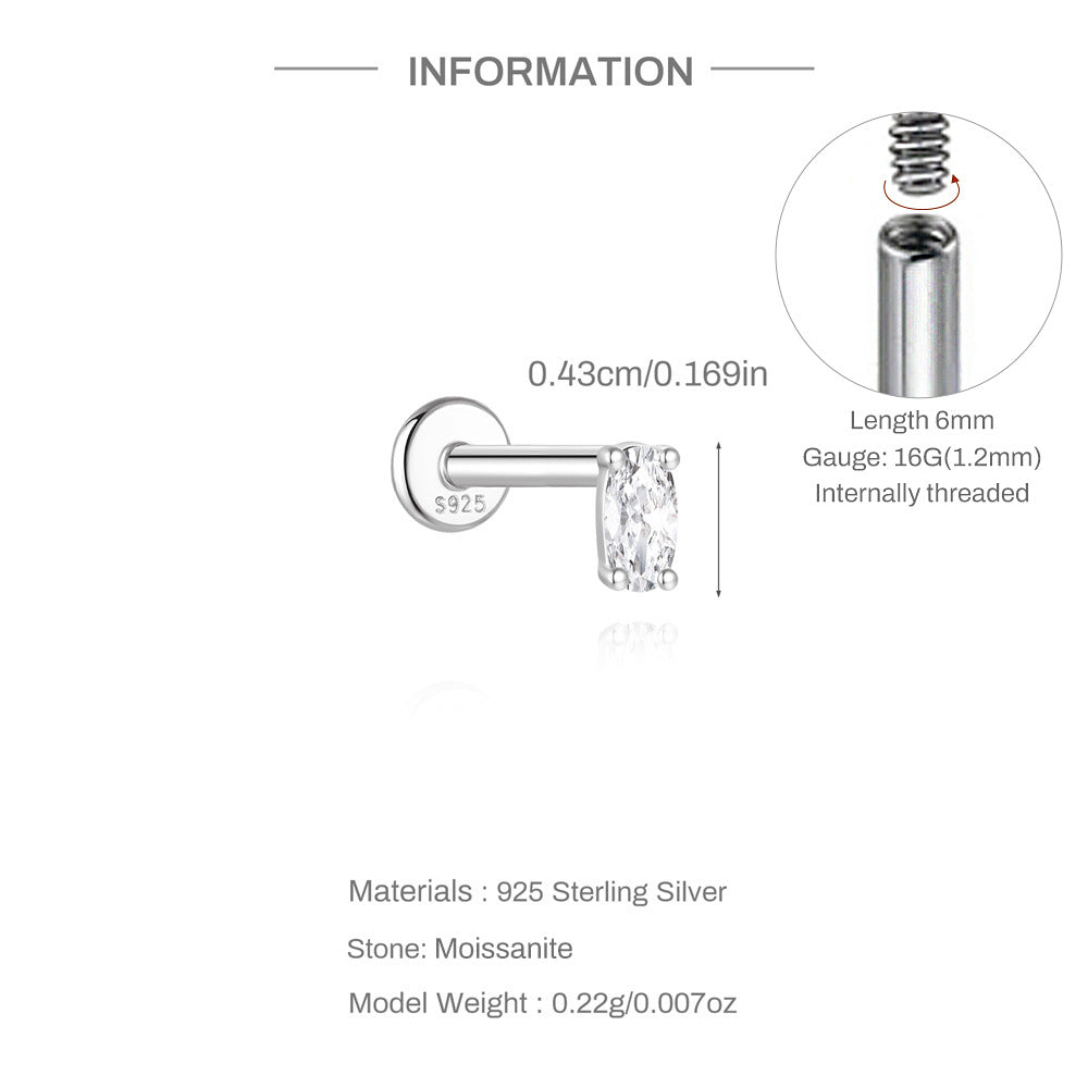 Marquise Cut Moissanite Flat Back Earring S925 Sterling Silver Delicate Cartilage Jewelry